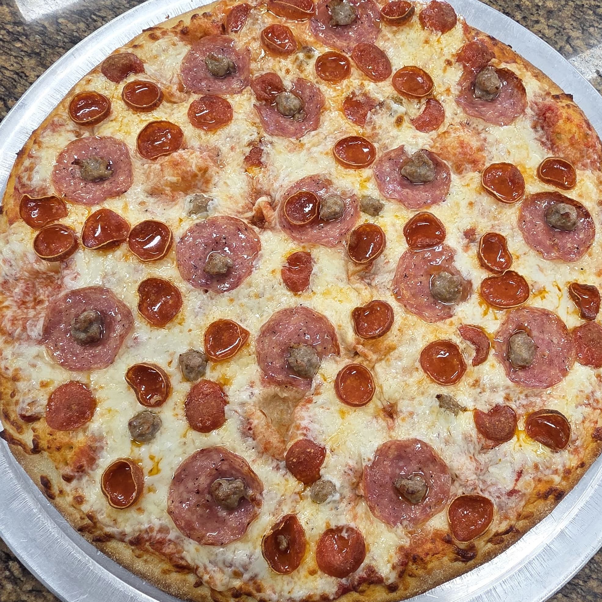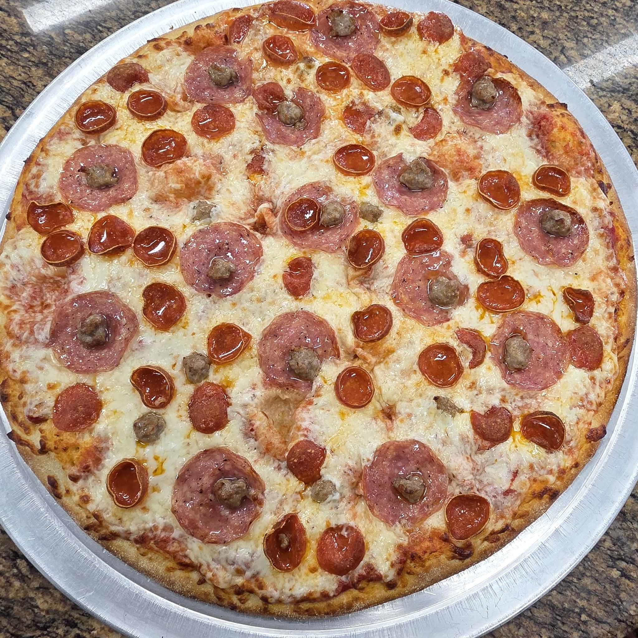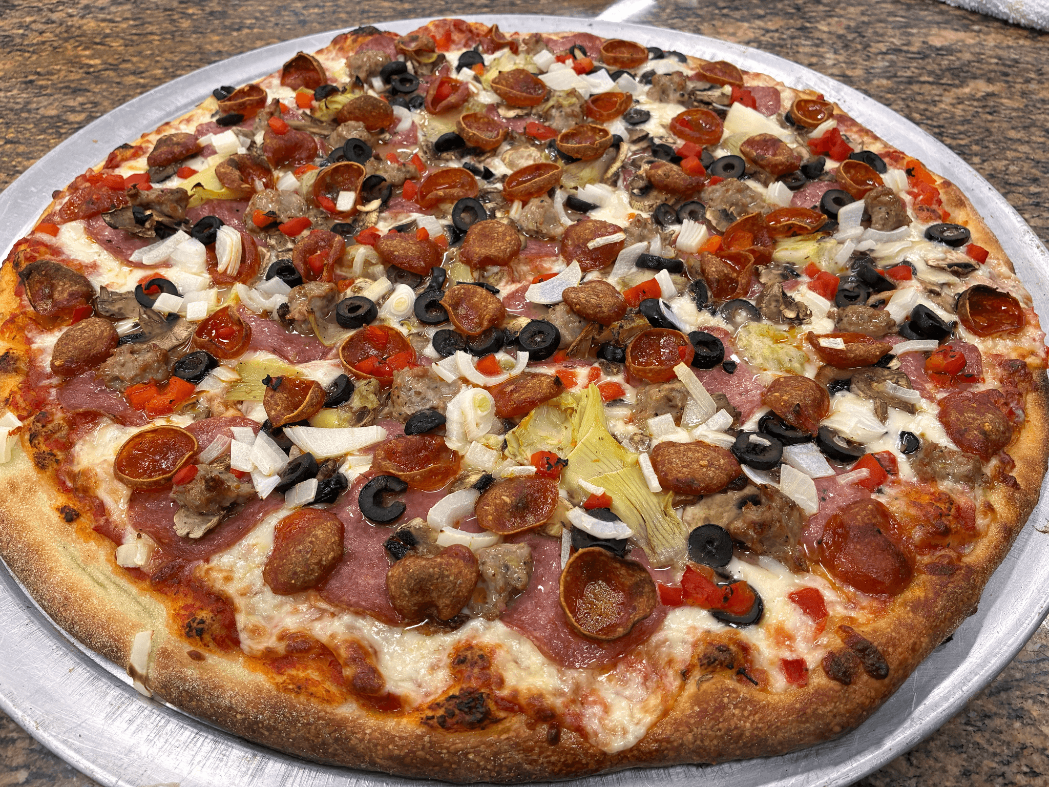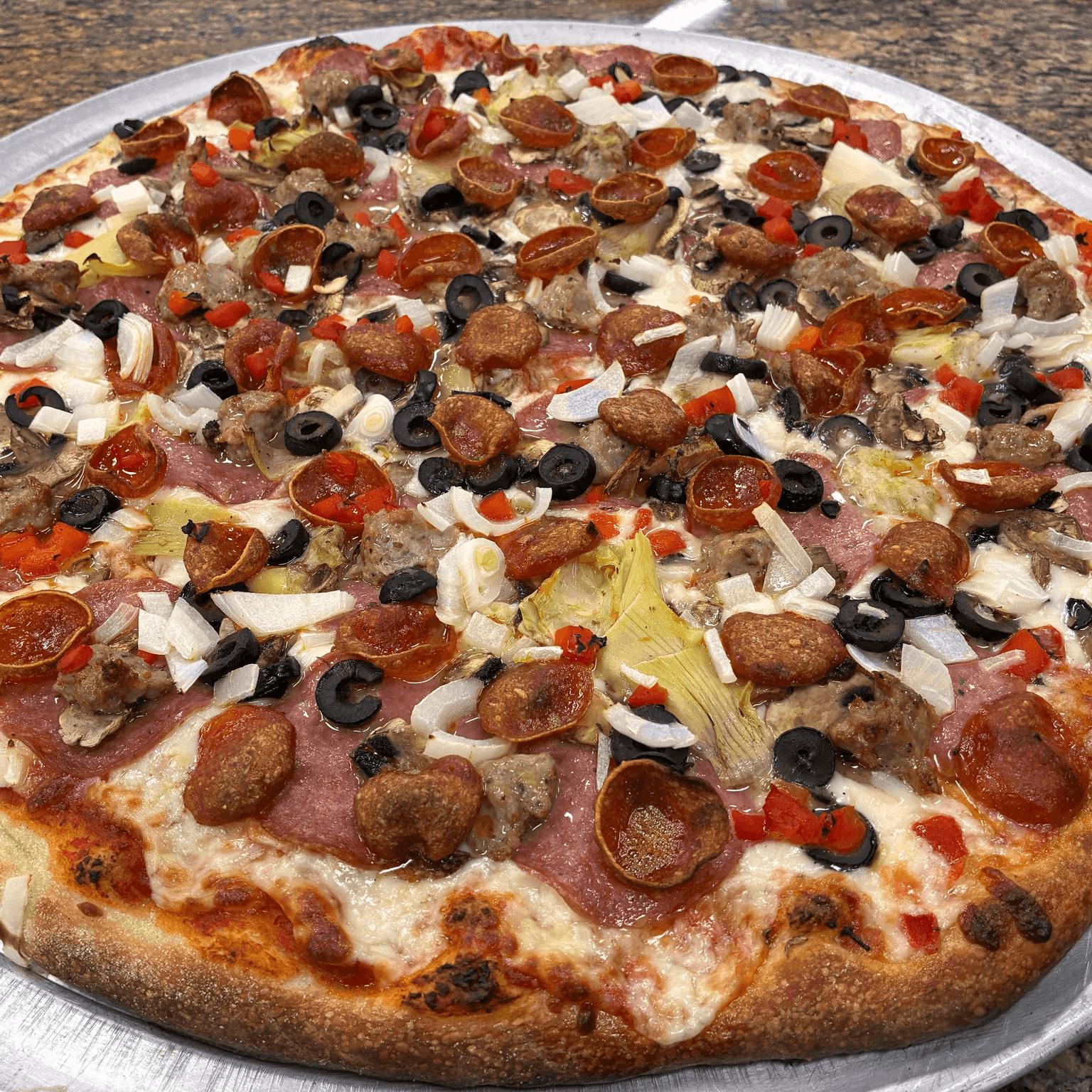 Salami, pepperoni, Italian sausage, black olives, mushrooms, white onion, roasted red peppers, artichoke hearts
