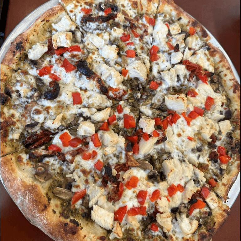 Basil/cashew pesto, chicken, sun-dried tomatoes, mushrooms, and mozzarella.