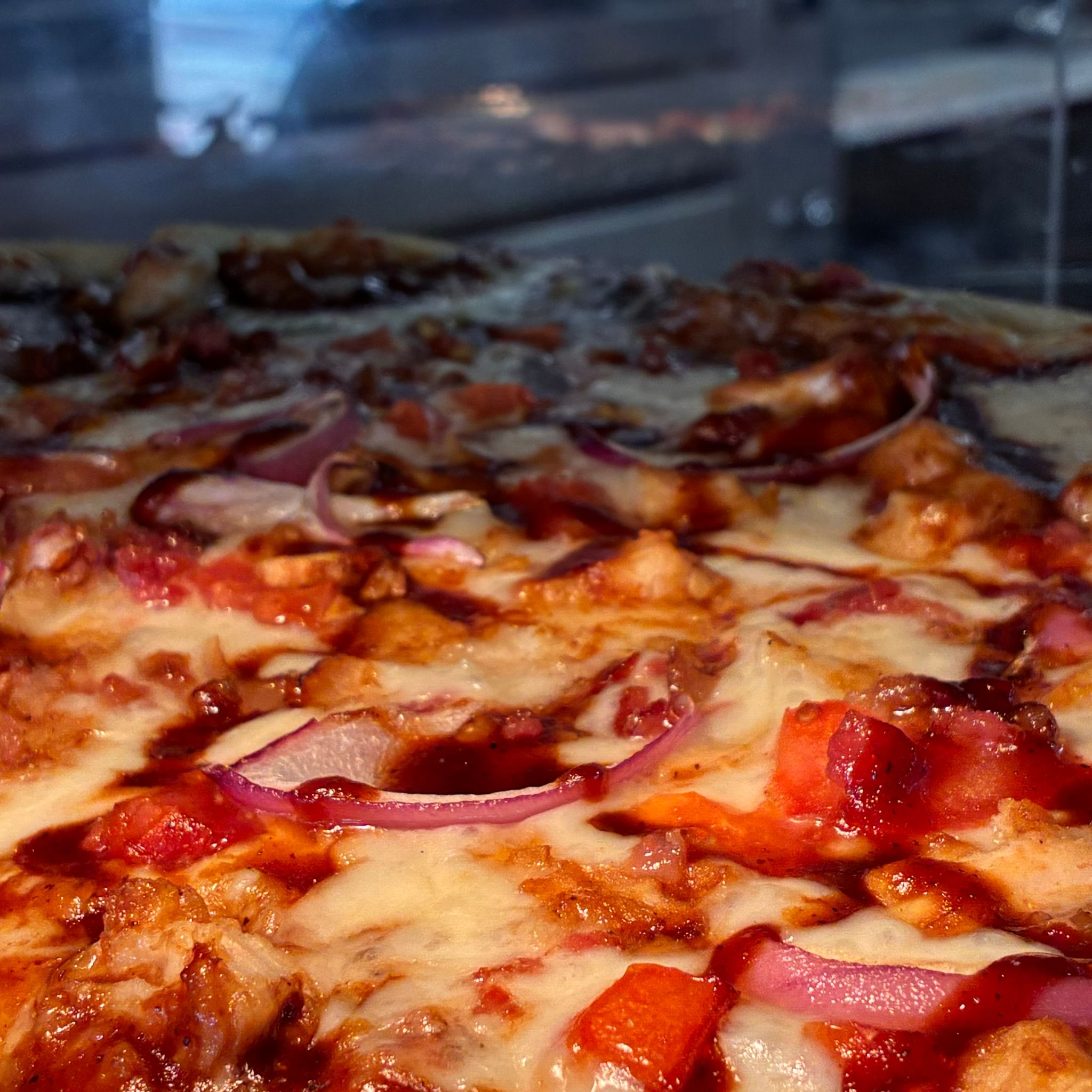 Barbecue sauce, red onion, chicken, bacon and tomato